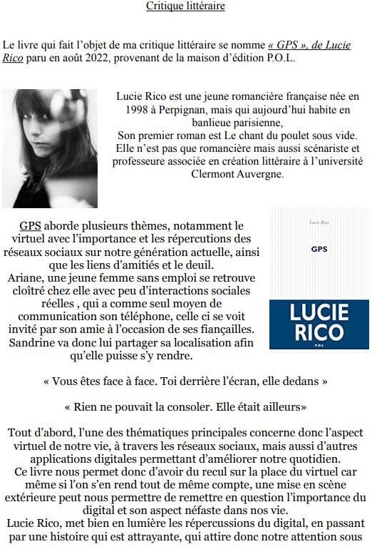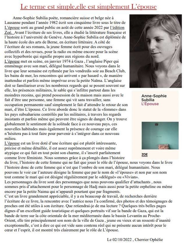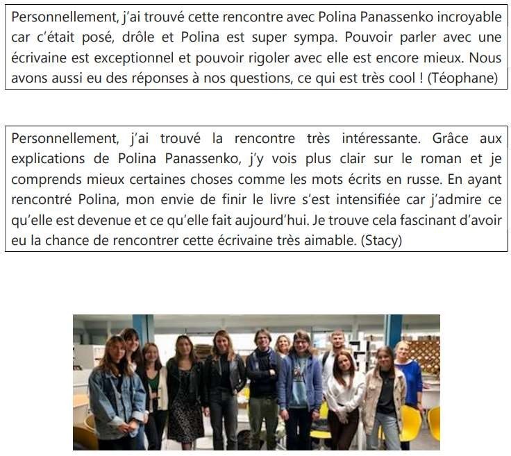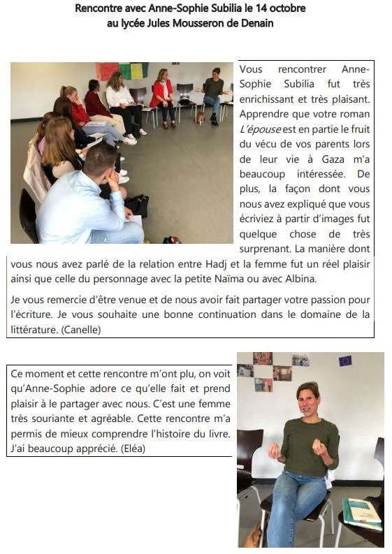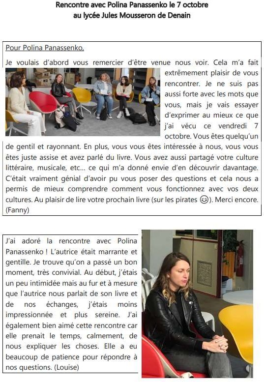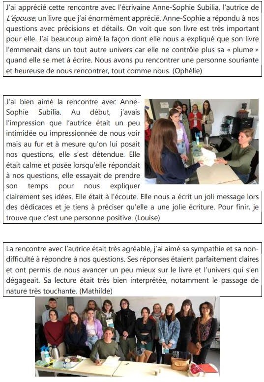 La forme était au choix des élèves, soit ils rédigeaient un article (annexe 4), soit ils faisaient une vidéo pour présenter leur livre préféré. Les chroniques littéraires ont été publiées sur le site « Ta voix » (site de La Voix du Nord dédié aux jeunes) et dans l’édition de Valenciennes de La Voix du Nord. Alexina, qui a réalisé une chronique sur Trouver refuge, a eu la chance de recevoir des félicitations de la part de l’auteur, Christophe Ono-dit-Biot qui a relayé sa chronique sur différents réseaux sociaux.