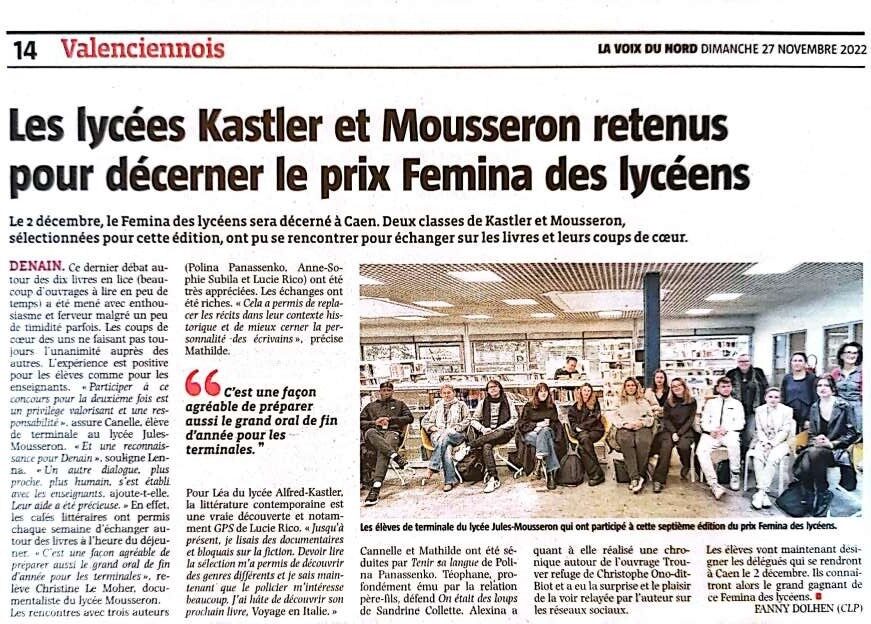 Voilà maintenant deux ans que le lycée Jules Mousseron de Denain participe au prix Femina des lycéens. C’est avec plaisir que nous avons appris que le groupe de Terminale, spécialité « Humanités, Littérature et Philosophie » a de nouveau été choisi pour participer en tant que jury à ce prix littéraire.