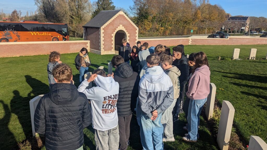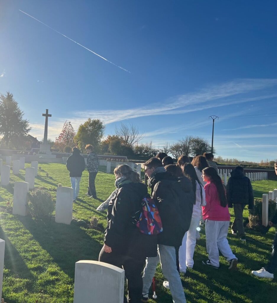 Malgré le froid, les élèves ont également visité le cimetière militaire de Pheasant Wood. Ce cimetière abrite les corps des soldats retrouvés et inhumés en 2010 suite à des fouilles archéologiques. La visite de ce site a servi de support pour aborder les notions de Mémoire et de Commémoration. Les