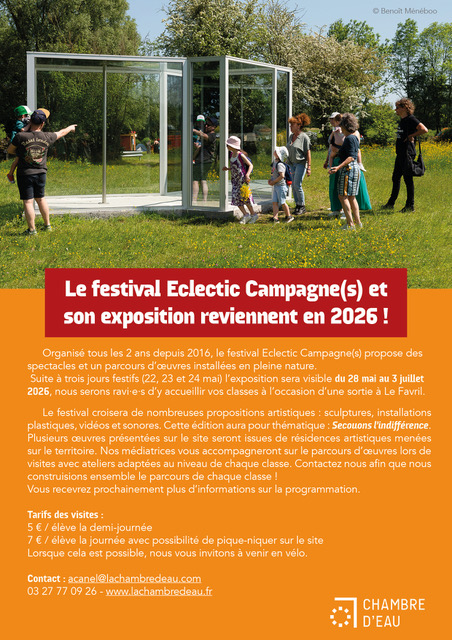 Jusqu’au mois de mai, nous accueillerons en résidence des artistes qui viendront imaginer et construire des œuvres d’art afin de les présenter lors des 3 jours de festival fin mai, (les 22, 23 et 24 mai) puis durant un mois d’ouverture pour les scolaires du 1er juin au 3 juillet. Il sera possible de profiter d’un parcours d’exposition en plein air, accompagné de notre équipe de médiation qui proposera des ateliers en lien avec les oeuvres visitées. Vous trouverez ici un aperçu de l’édition précédente en 2023 : https://www.lachambredeau.fr/eclectic-campagnes-2023