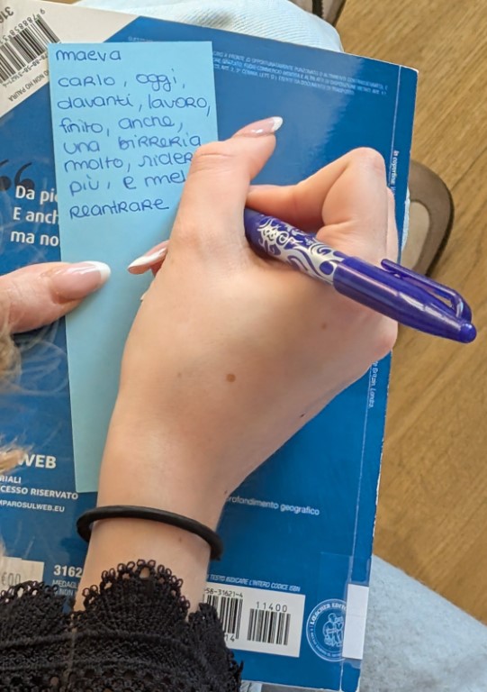 Chaque élève choisit un extrait qu’il lit à voix haute. Les camarades doivent noter le plus de mots compris possible, ce qui encourage le lecteur à parler plus lentement, mieux articuler et soigner la prononciation. Le tout se déroule dans une ambiance conviviale accompagnée de biscuits italiens, un élément « importantissimo » pour les participants.